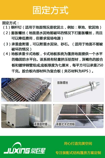 1. 膨脹螺絲:適用于地面是水泥或瀝青等硬化地面且能破壞的情況;常見的固定方式: